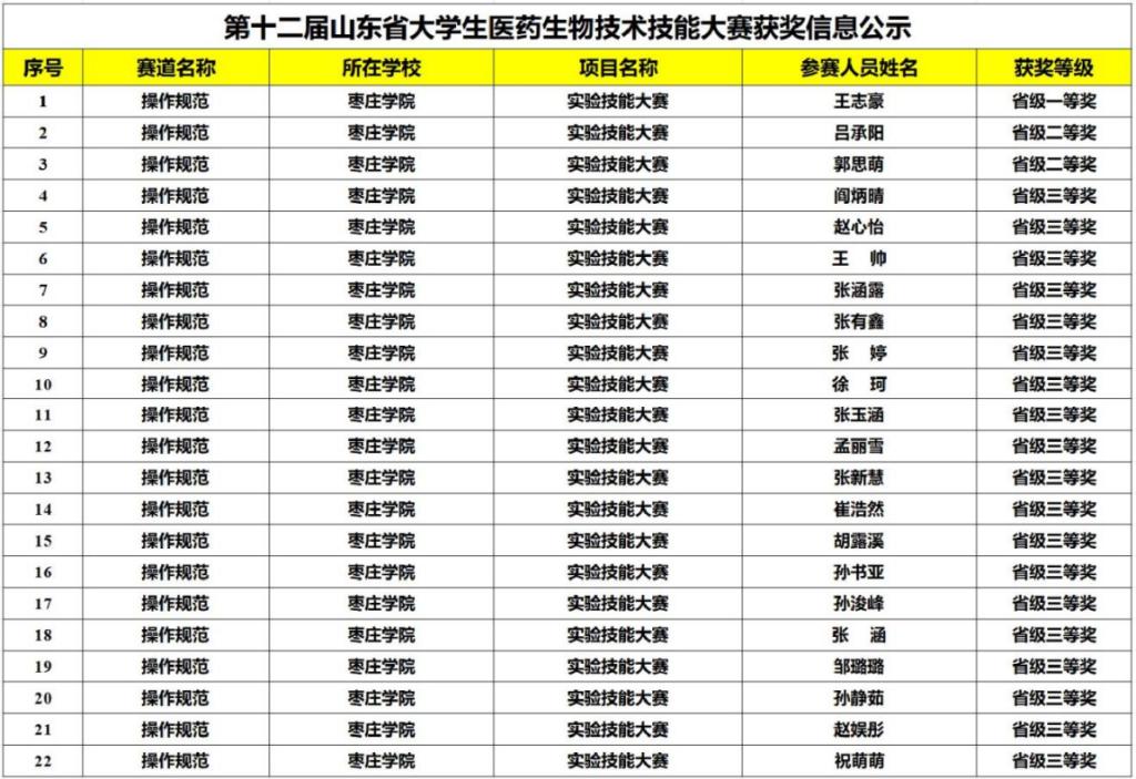 11月7日-11月8日,第十二届山东省大学生医药生物技术技能大赛在济宁医学院举办。此次比赛中,我院学子分别荣获实验技能操作赛道一等奖1项、二等奖2项、三等奖19项;创新创业赛道一等奖1项、二等奖7项、三等奖7项。