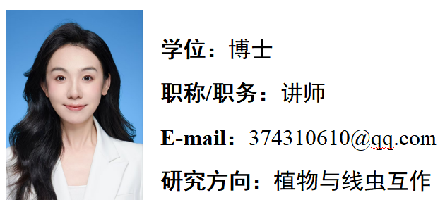 2021年6月毕业于中国科学院大学,获理学博士学位。同年进入中国科学院东北地理与农业生态研究所从事博士后研究,于2024年7月出站,出站后任助理研究员。2026年3月进入枣庄学院生命科学学院工作。主要在分子和遗传水平上研究植物对线虫病抗性机理。作为项目骨干参与国家自然科学基金、中科院先导科技专项等。近五年来以第一作者或者共同作者在《Journal of Agricultural and Food Chemistry》、《Frontiers in Plant Science》、《Plant Genome》、《Nematology》等刊物上发表SCI论文4篇。