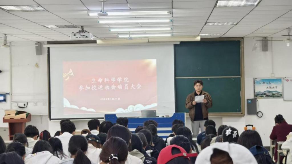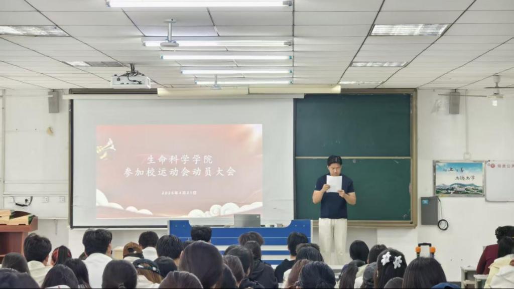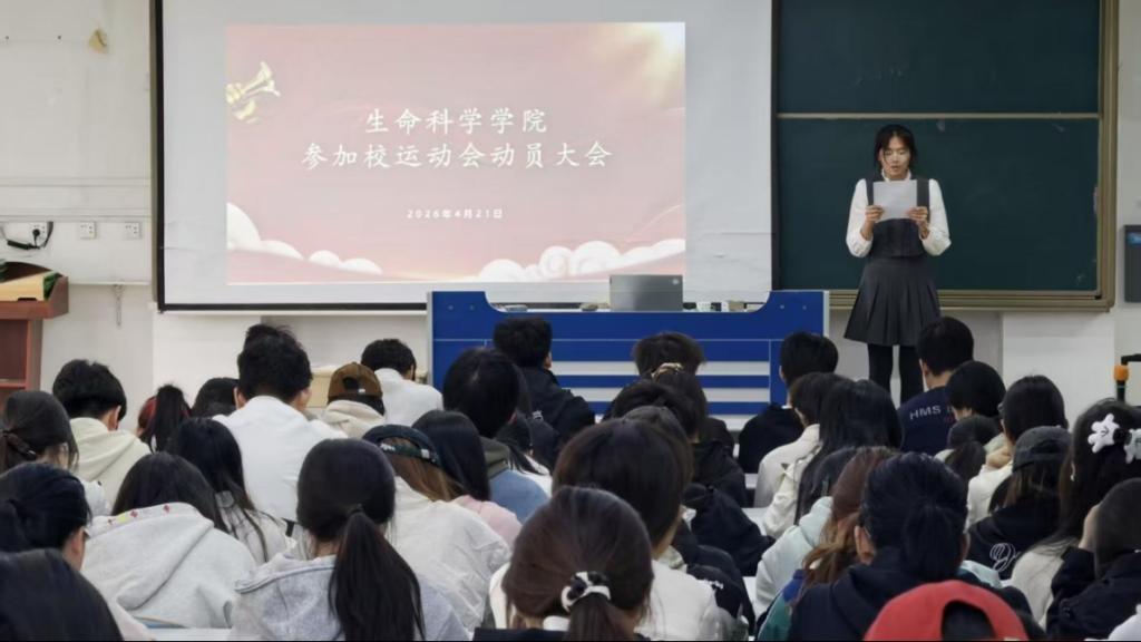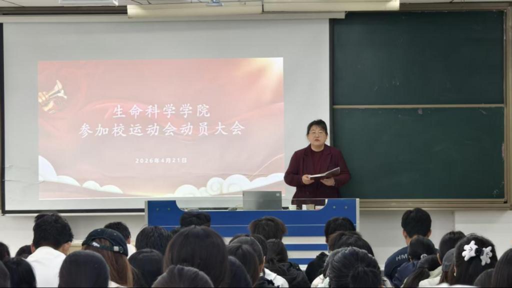 为了迎接即将到来的校运会,激发师生的参赛热情,4月21日上午,生命科学学院在理工楼2205召开2026年校运动会动员大会。学院党委副书记韩笑、辅导员褚宏宇以及全体运动员、方队队员、团体操同学共同参会。大会由褚宏宇主持